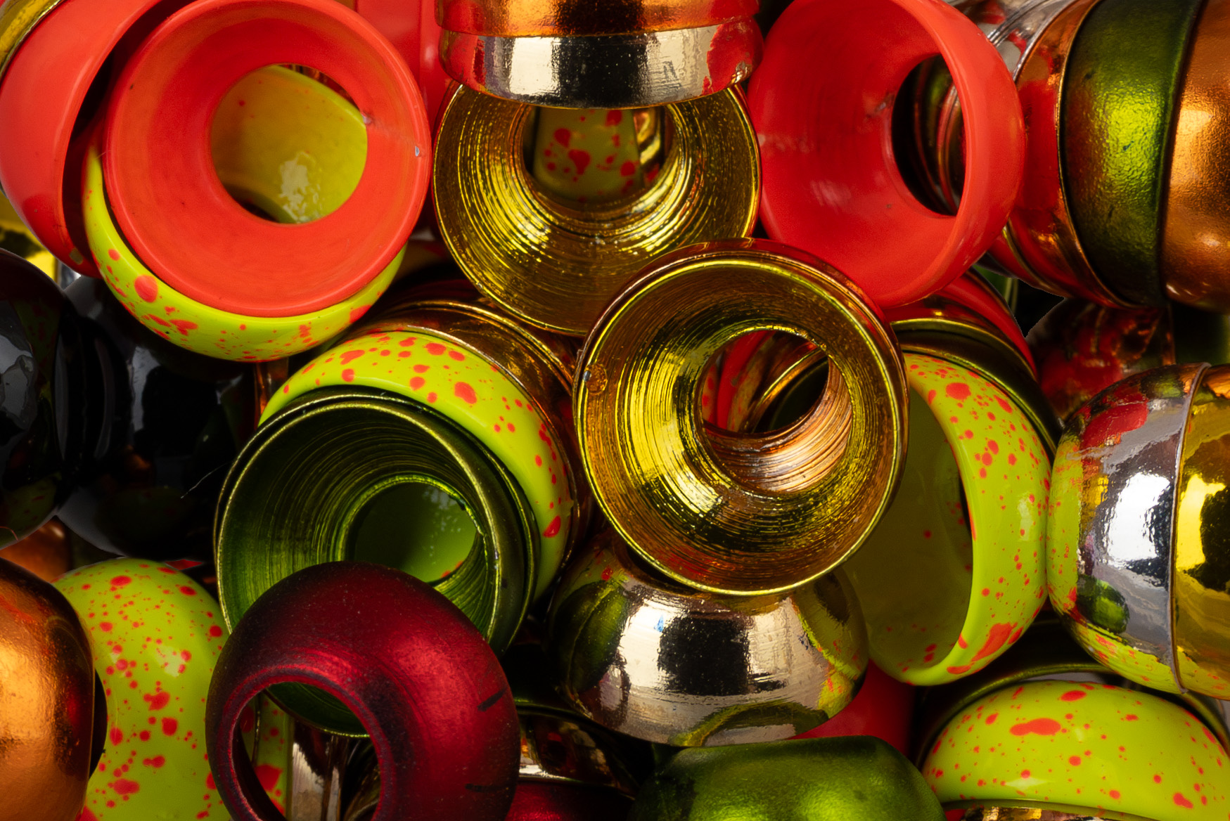 They are 10mm and have a holesize in 4,7mm, so they fit perfectly on the Predator Tubes wich are 4,6mm, the weight is 0,60grams, so they are easy to cast. To start with we made theme in Silver-Gold-Black – Mat Metallic Olive – Mat Metallic Red – Metallic Golden Orange These Coneheads are very high quality 10 in a pack