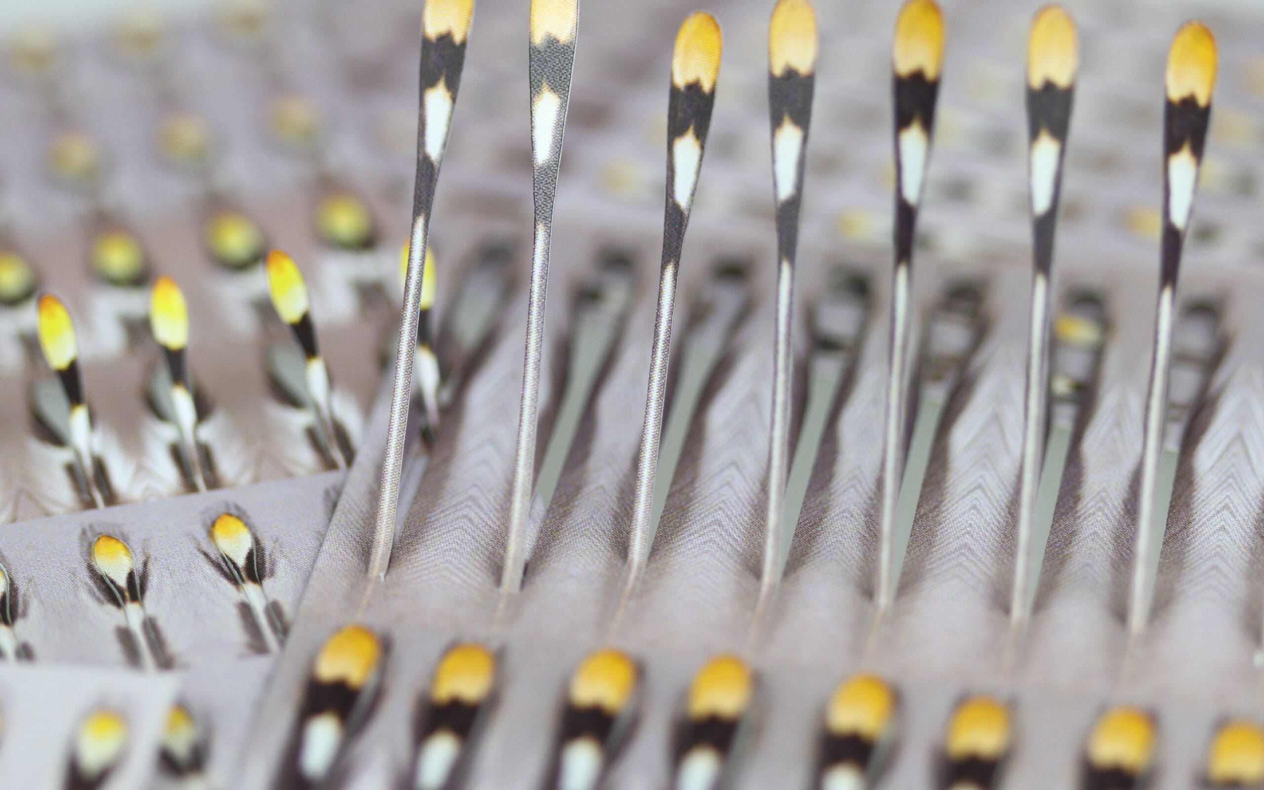 These Jungle Cock subs we have been working on a couple of years now. The hard part was to find the way to lazer cut theme so they would be very thind in the “stem” just like a nautral feather, and we found the way:-) They are made of one layer very strong fabric and are moving very well in the water. They vill never split in 2 We made them in 4 size, and packed them with 48 eyes in each pack. .
